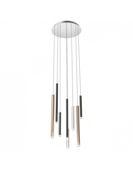 Sospensione per interni con LED SMD integrato, struttura in metallo e alluminio spazzolato disponibile nelle seguenti finiture: anodizzato oro opaco, anodizzato rame opaco, anodizzato nero opaco oppure versione con basetta frontale cromata e tubi alluminio spazzolato, anodizzato marrone opaco, anodizzato nero opaco. Diffusori in acrilico trasparente.